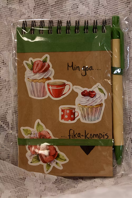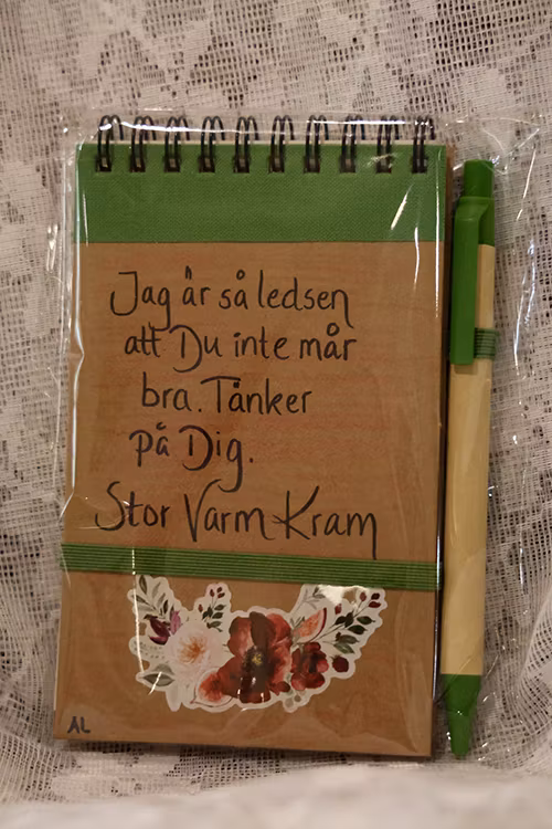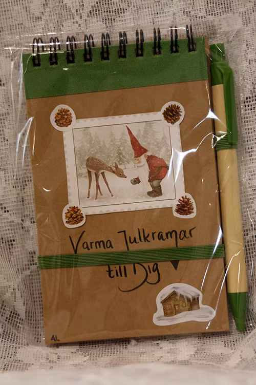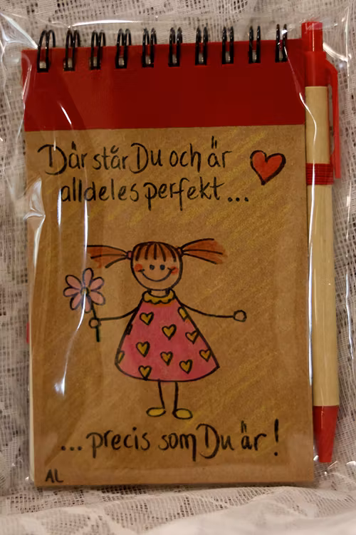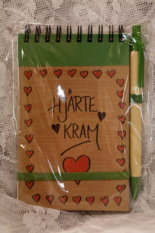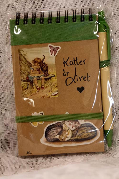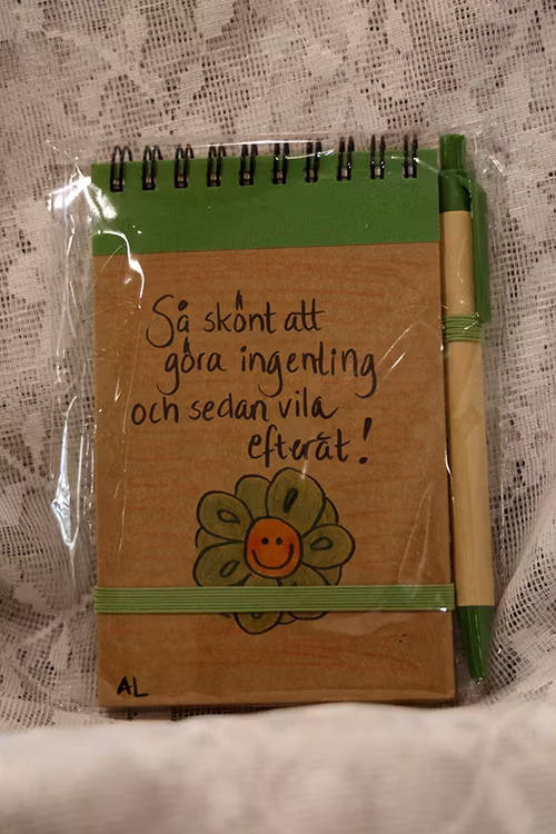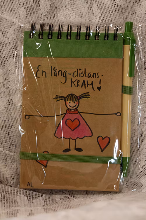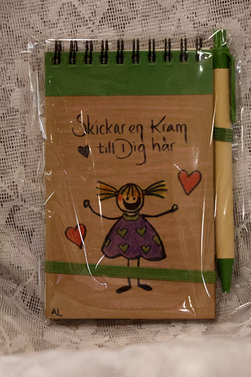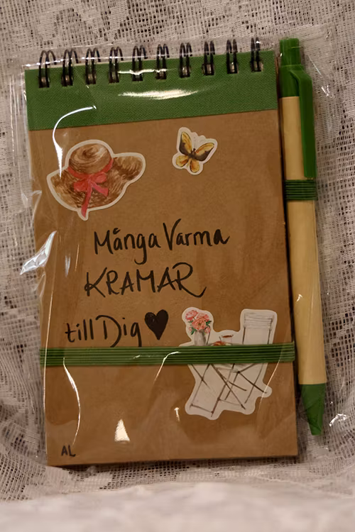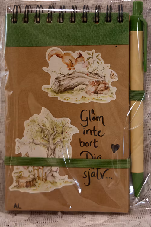 Anteckningsblock med 120 blanka sidor, pennhållare och bläckpenna.