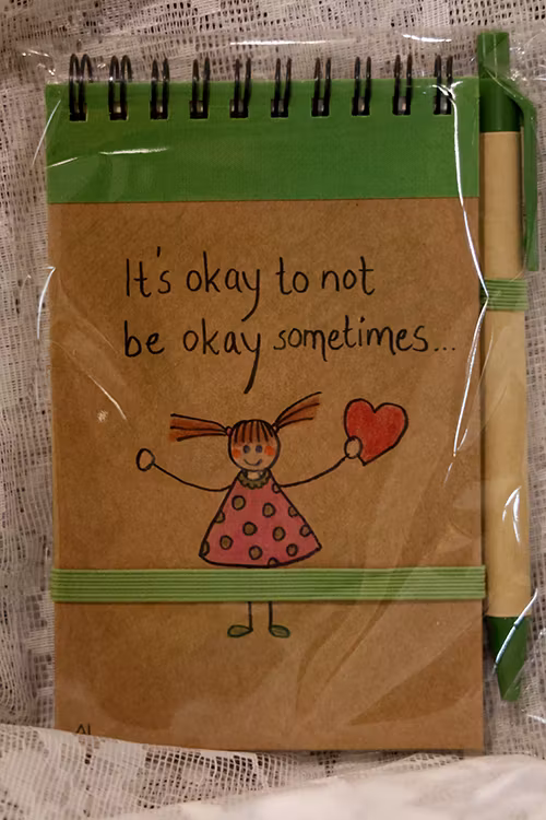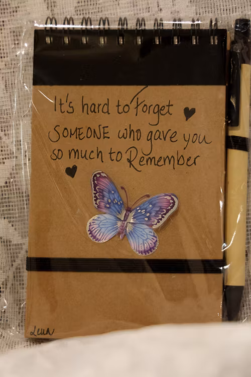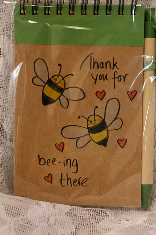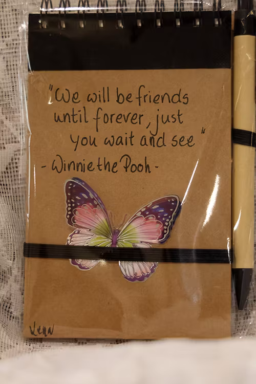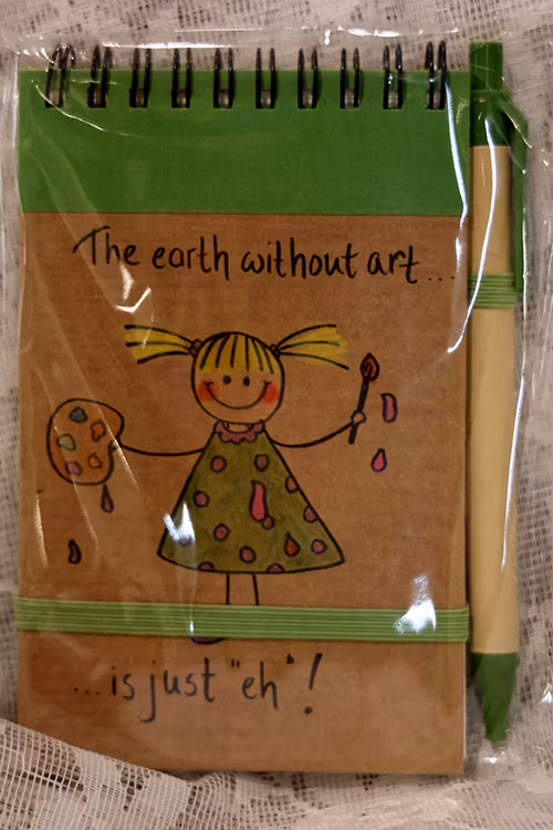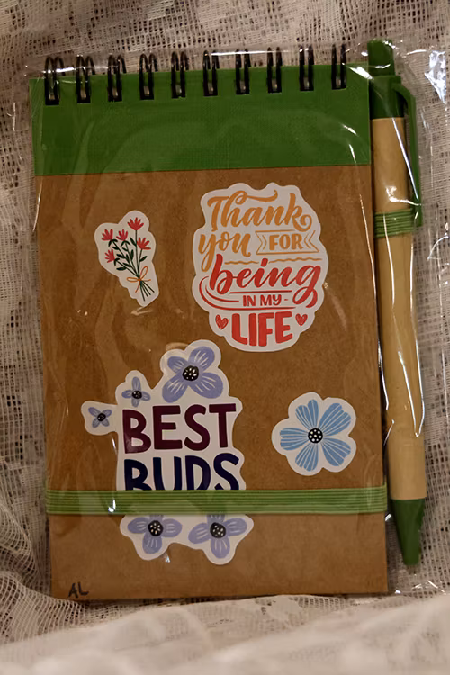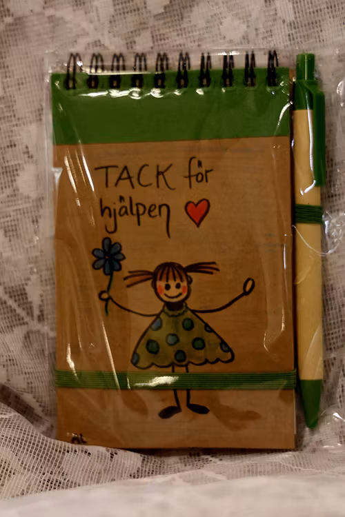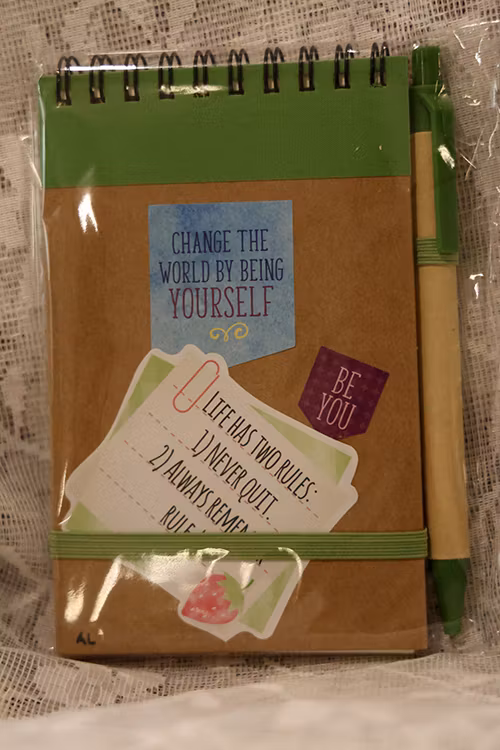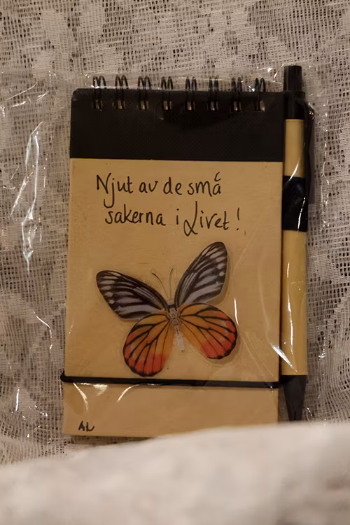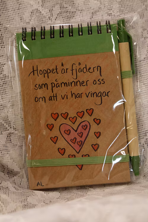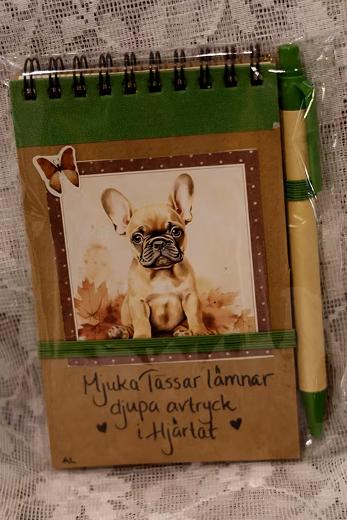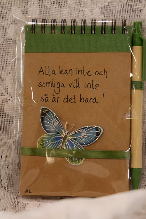 Anteckningsblock med 120 blanka sidor, pennhållare och bläckpenna.