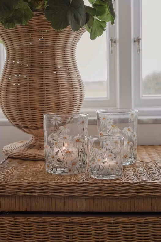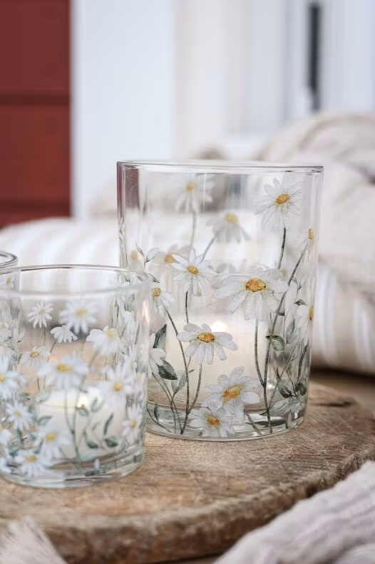 Ljuvlig lykta med ett vackert och somrigt mönster av prästkragar. En underbar detalj i ditt hem eller utomhus när du vill duka sommarfint.