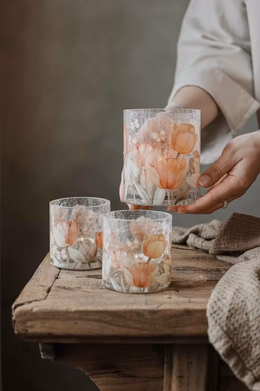 Skapa en mysig och inbjudande stämning i hemmet med denna krackelerade glaslykta, dekorerad med ett elegant tulpanmönster. När du tänder ljus i lyktan sprider det krackelerade glaset ett mjukt och glittrande sken och skapar välkomnande stämning i hemmet.