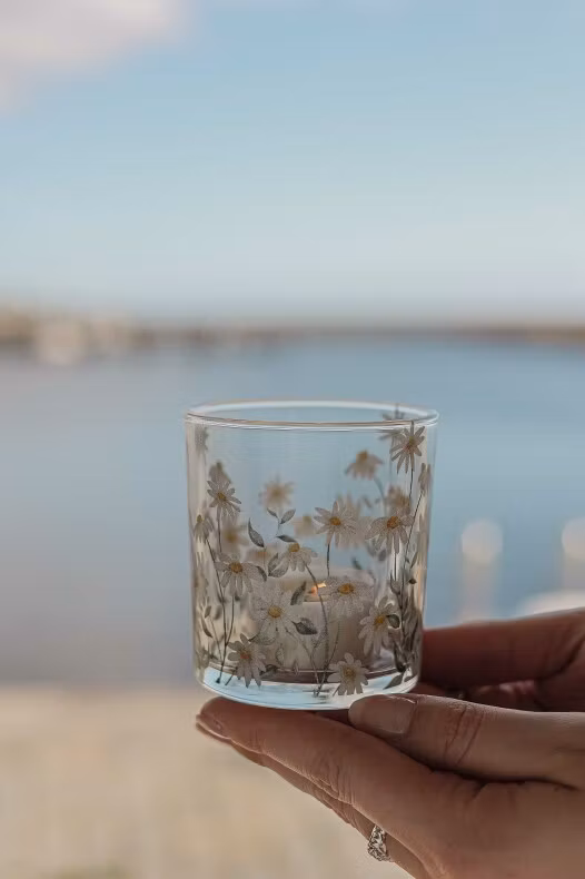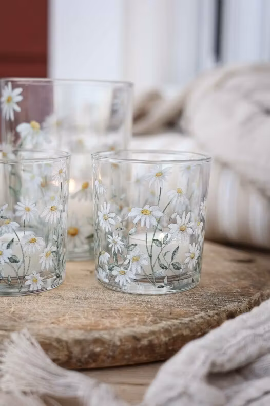 Ljuvlig lykta med ett vackert och somrigt mönster av prästkragar. En underbar detalj i ditt hem eller utomhus när du vill duka sommarfint.