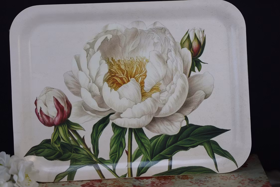 Bricka från Sköna Ting i Björkfanér med motiv av vackra vita Pioner.