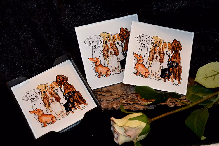 Hundar på glasunderlägg 120 kr Produkten är tyvärr slut i lager just nu! Produktbeskrivning Härliga hundar som sitter på rad som glasunderlägg! En uppskattad & användbar gåva.6 st / förpackning.Mått: 10 cm x 10 cm