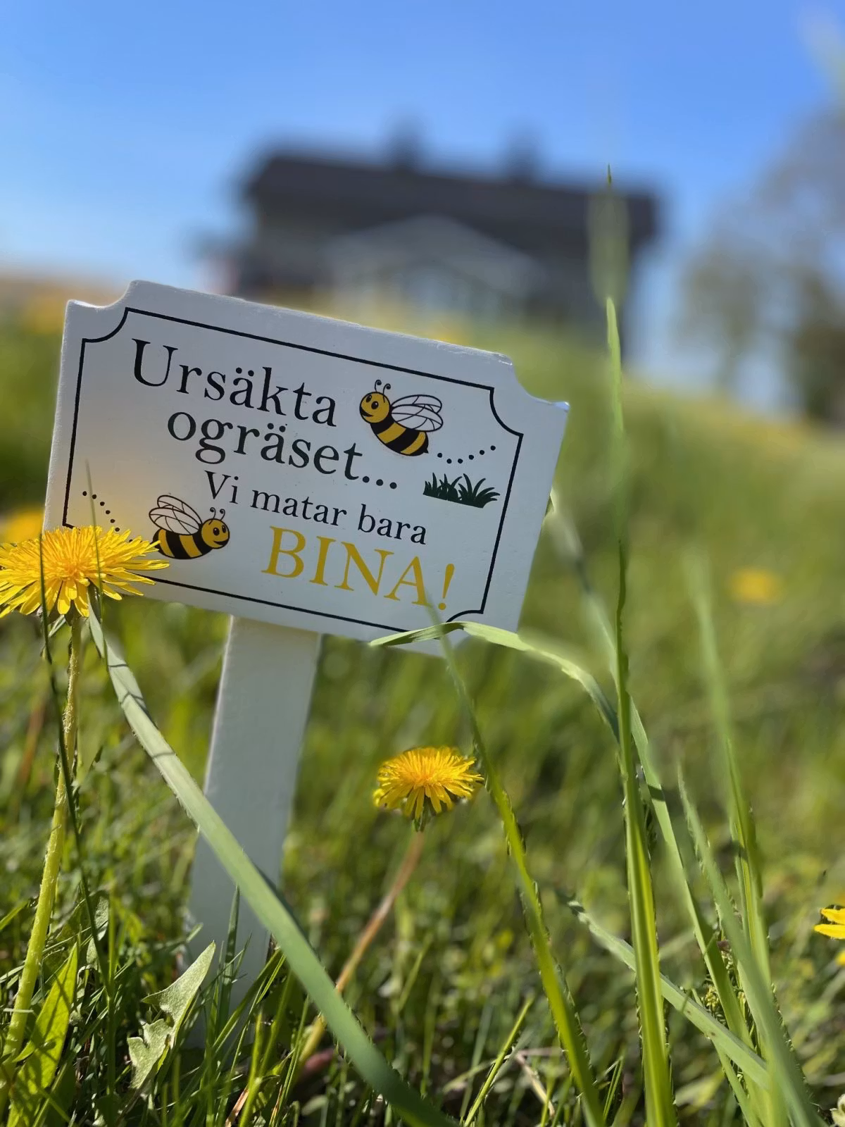 Text på skylt: Ursäkta Ogräset... Vi matar bara bina!