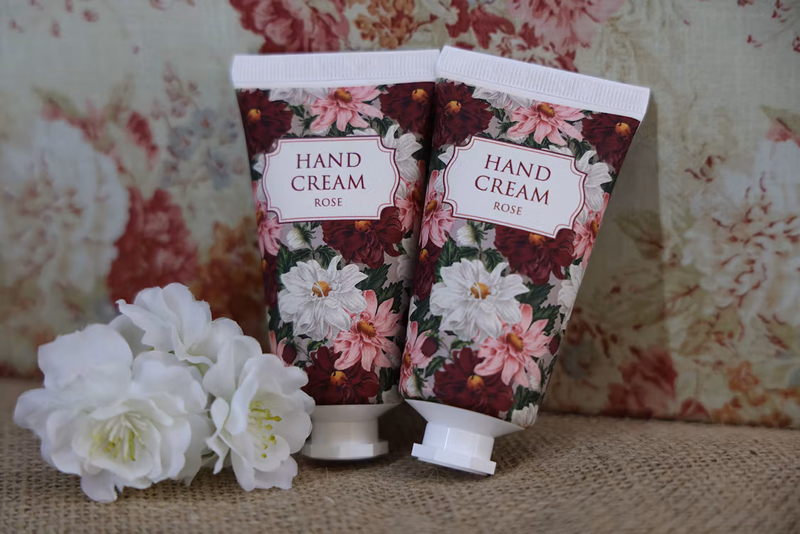 Handcreme med härlig doft av Ros och med ett vackert Blomstermotiv.