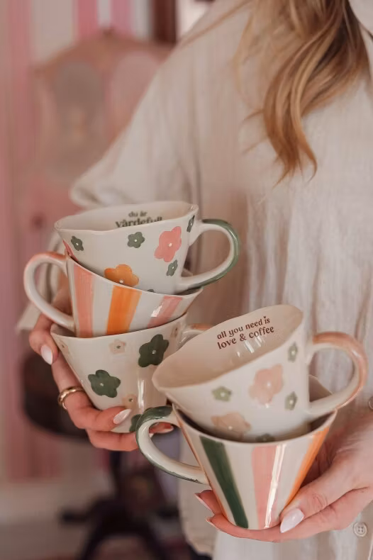Ljuvlig mugg med handmålat mönster i glada härliga färger som tillsammans med budskapet sprider mycket glädje!