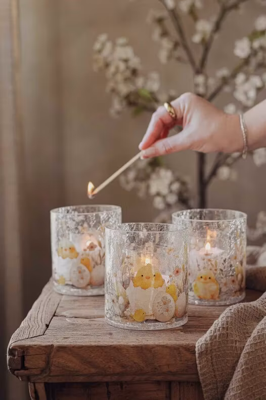 Denna vackra handgjorda krackelerade glaslykta har ett mönster av påskens söta kycklingar och blommor!
