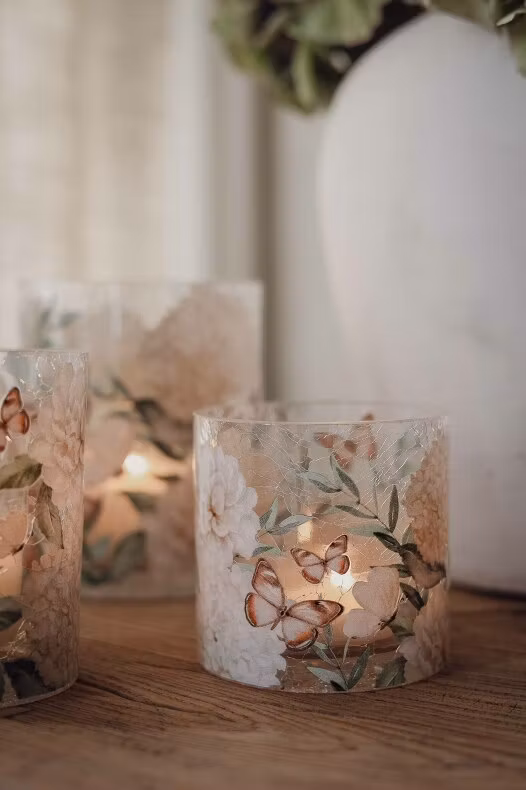 Handgjord krackelerad glaslykta med mönster av vackra Hortensior och Fjärilar. Denna vackra lykta finns i tre storlekar, detta är den minsta storleken.