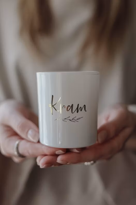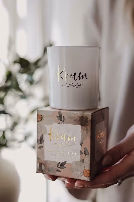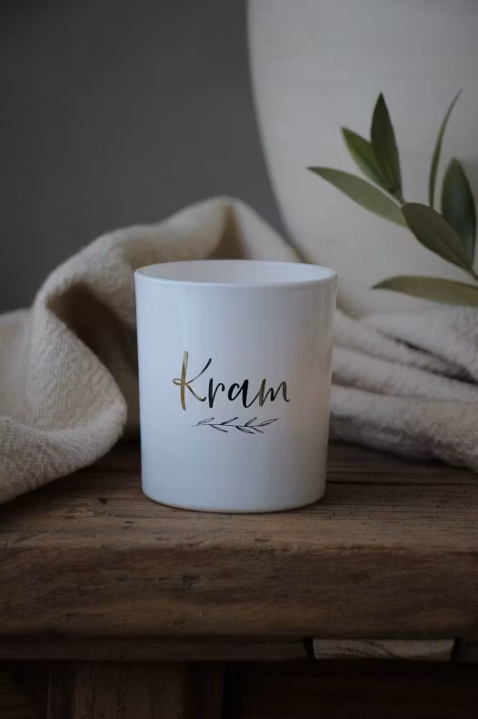Den stilrena vita lyktan med guldfärgad dekal bär det enkla ordet ”Kram” och levereras i en vacker presentförpackning med samma text och matchande mönster.